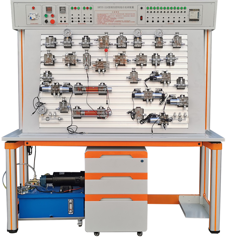 液壓綜合實(shí)驗臺由實(shí)驗桌、實(shí)驗操作區、網(wǎng)孔工具掛板、液壓泵站、常用液壓元件、主控機箱、電腦桌等幾部分組成。