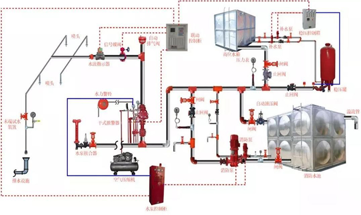 干式系統的基本構成條件包括水源、加壓與穩壓設施、壓力氣源、報警裝置、管網(wǎng)及閉式噴頭等部分。