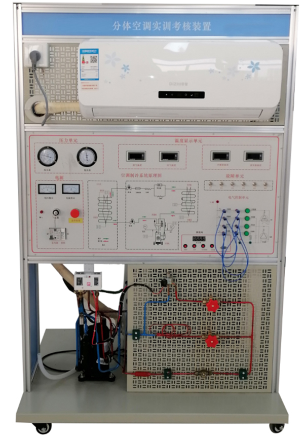 2、裝置直觀(guān)展示了空調的系統結構和工作原理,便于教學(xué)演示講解及學(xué)生對課本知識的理解掌握。配置的交流電壓表、交流電流表、溫度表、真空壓力表以及相應的信號指示燈,使整個(gè)空調系統的實(shí)時(shí)工作狀態(tài)一目了然;