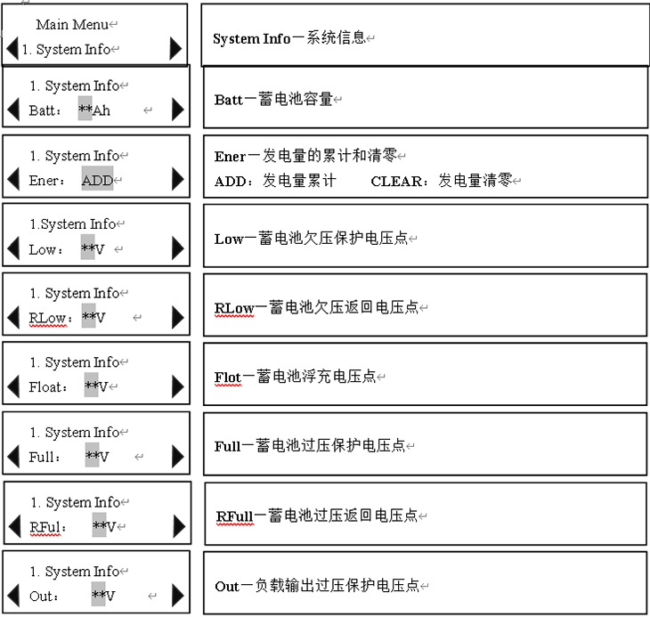 系統電壓、最大充電電流、太陽(yáng)電池方陣輸入路數、電路自身?yè)p耗、充滿(mǎn)斷開(kāi)或過(guò)壓關(guān)斷電壓(HVD) 、欠壓斷開(kāi)或欠壓關(guān)斷電壓(LVD)、蓄電池充電浮充電壓、溫度補償、使用或工作環(huán)境溫度范圍、其他保護功能