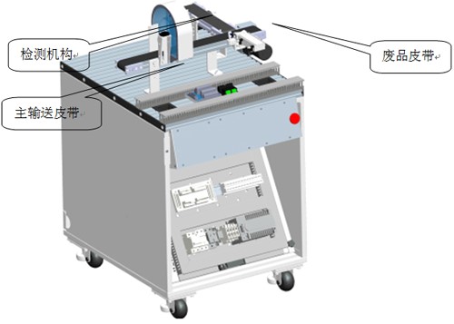 主皮帶運行,接收上一站擰好蓋后的物料瓶子,當物料瓶經(jīng)過(guò)檢測機構時(shí):回歸反射傳感器檢測瓶蓋是否擰緊;檢測機構檢測瓶子內部顆粒是否符合要求;對擰蓋與顆粒均合格的瓶子進(jìn)行瓶蓋顏色判別區分;擰蓋或顆粒不合格的瓶子被分揀機構推送到廢品皮帶上(短皮帶);擰蓋與顆粒均合格的瓶子被輸送到皮帶末端,等待機器人搬運。