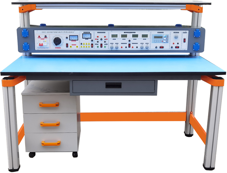 電子技能與電子工藝綜合實(shí)訓裝置由儀器架、主機箱、實(shí)驗桌、移動(dòng)矮柜、學(xué)生凳等組成。實(shí)驗裝置支架與實(shí)驗桌可組合、可拆裝。支架與桌腳一體,鋁合金結構。