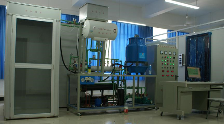 1)制冷機組:包括1臺3匹旋轉式壓縮機、殼管式冷凝器、干式蒸發(fā)器、儲液罐、內平衡式熱力膨脹閥、干燥過(guò)濾器等組成,管路中還設有操作手閥、高低壓力控制器、壓力表等實(shí)訓所必需的部件;此外,管路中設有視液鏡可觀(guān)察制冷劑狀態(tài);同時(shí)設有明顯的顏色標識,高壓管路部分為紅色標識,低壓管路部分為藍色標識,并套有保溫材料。