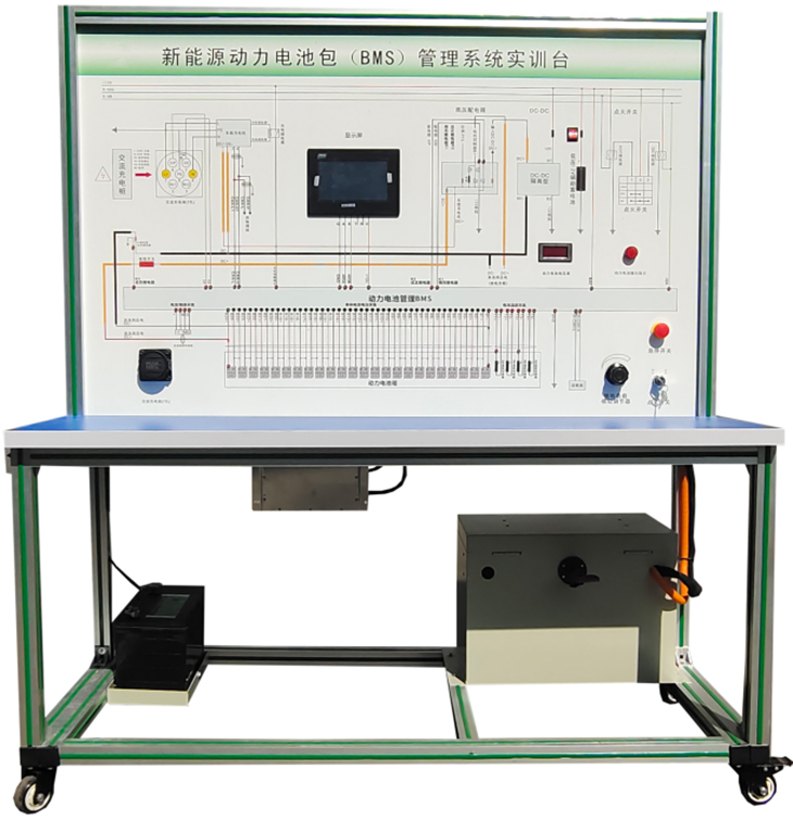 磷酸鐵鋰動(dòng)力電池包與鐵制電池箱(單體電池3.2V 20AH,24串)、BMS鋰電管理一體機、動(dòng)力電池包觸摸顯示屏、車(chē)載充電機、國標充電插口、國標充電槍、緊急斷電開(kāi)關(guān)、霍爾電流傳感器、直流接觸器(包含充電繼電器、總正繼電器、總負繼電器、預充繼電器)、DC-DC轉換器(72V-12V30A)、輔助蓄電池(12V45AH)、放電控制繼電器與放電負載電阻、預充電阻器、可移動(dòng)實(shí)訓臺(1500×700×1700mm 帶自鎖腳輪裝置,帶安裝檢測端子的原理面板,面板1448×940mm)、故障模擬與排除裝置、設備操作說(shuō)明書(shū)。