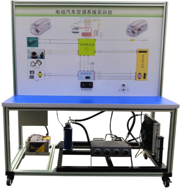 點(diǎn)火開(kāi)關(guān)、電動(dòng)汽車(chē)空調壓縮機、膨脹閥總成、干燥器總成、鼓風(fēng)機總成、冷凝器、冷卻電子風(fēng)扇、電動(dòng)空調壓縮機控制器總成、空調蒸發(fā)箱總成、充電器與充電接口、充電插線(xiàn)、DC-DC轉換器、鋰電池組、空調操作面板、高低壓空調壓力表、采暖模塊總成、電源總開(kāi)關(guān)、急停開(kāi)關(guān)、直流接觸器、輔助蓄電池(12V45AH)、一體化全鋁合金型材搭建的移動(dòng)臺架(1500×700×1700mm 帶自鎖腳輪裝置,帶安裝檢測端子的原理面板,面板1448×940mm)、故障模擬與排除裝置、設備操作說(shuō)明書(shū)。