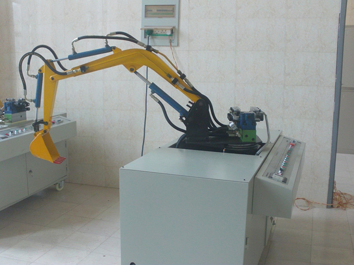 3、挖掘機械按實(shí)物比例縮小的全金屬結構,實(shí)驗時(shí)啟動(dòng)液壓系統根據實(shí)驗要求模以操作機械進(jìn)行工作。