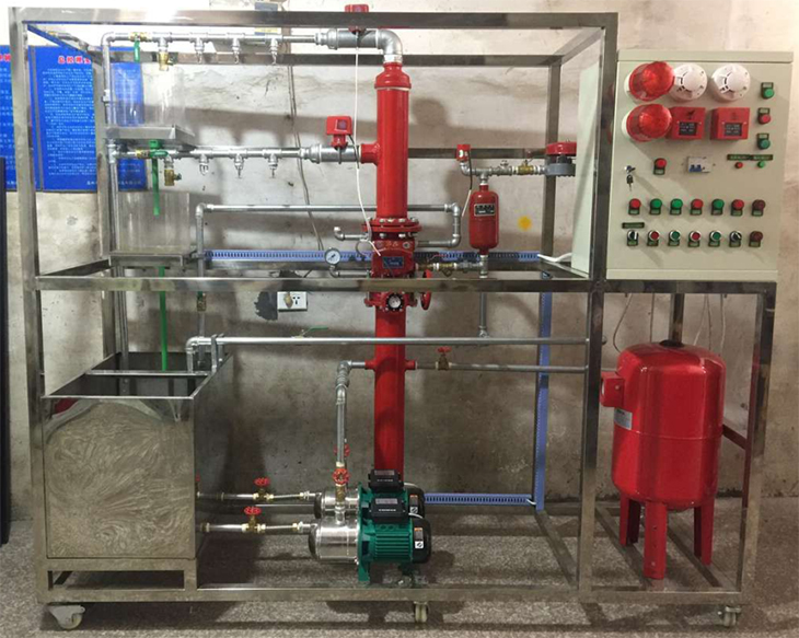 2.模型框架和水箱等主要部件全部使用不銹鋼器件,保證不生銹、不易老化,模擬兩層大樓噴淋滅火系統;模型系統主要由噴淋水泵、氣壓罐、濕式報警閥、水力警鈴、延時(shí)器、壓力開(kāi)關(guān)、水流指示器、封閉式噴頭、試驗閥、火災探測器、火災報警器等典型噴水滅火設備構成,能生動(dòng)模擬大樓內水滅火系統的典型結構。
