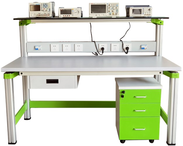 實(shí)訓桌規格為1600(長(cháng))*700(寬)*1150(高),設有一個(gè)抽屜;實(shí)驗桌主體結構全部采用高性能表面氧化的鋁型材及一次成型鋁壓鑄框架連接構件,連接構件采用壓鑄成型工藝(非焊接工藝),經(jīng)機加工、拋丸、噴砂,表面靜電噴涂工藝,安裝方便、快捷,用戶(hù)可自行DIY組裝。桌體立柱采用工業(yè)鋁型材成型工藝,表面氧化處理,截面尺寸:70mm×70mm,四面帶槽,槽寬約8mm,端部裝有注塑成型配套塑料堵頭。桌面采用25mmE1級三聚氰胺飾面板,桌面板下設支撐框架,承受力不少于300kg。配備儲存柜,存放元件及工具,儲存柜底部4只高強度萬(wàn)向可制動(dòng)PU腳輪,方便移動(dòng)。實(shí)訓裝置整體簡(jiǎn)約不簡(jiǎn)單,高端大氣,符合現代化產(chǎn)品審美和發(fā)展趨勢。