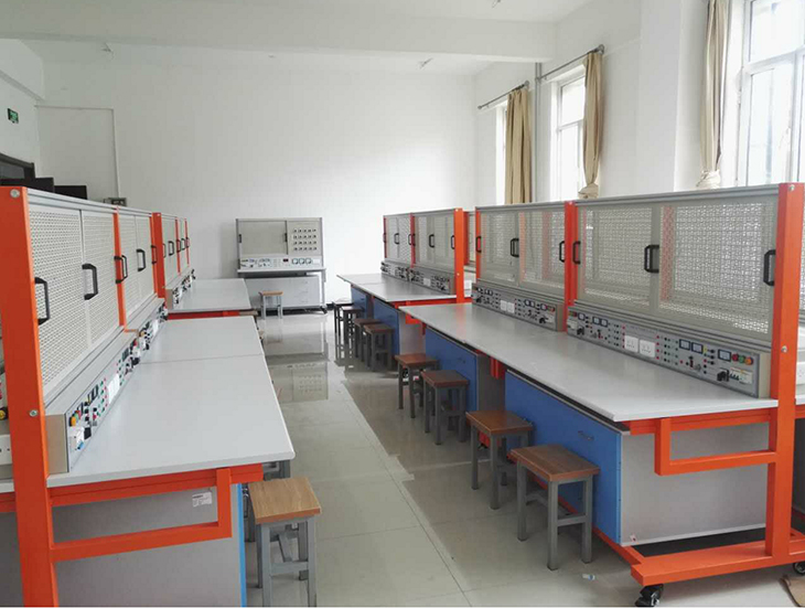 1、以30mm×30mm成型方鋼作為設備主要框架材料;實(shí)訓屏、地盤(pán)采用焊接連接、關(guān)鍵部位采用三角筋用內六角螺釘加固連接,表面經(jīng)高溫噴塑處理,美觀(guān)大方且有效起到防銹絕緣的作用;由兩條35mm×35mm鋁合金型材及滑槽組成網(wǎng)孔板固定機構;固定機構的下方每面是鐵制雙工位電源箱,每工位電源箱的布局依次為電源保護裝置、電源指示裝置、電源輸出;