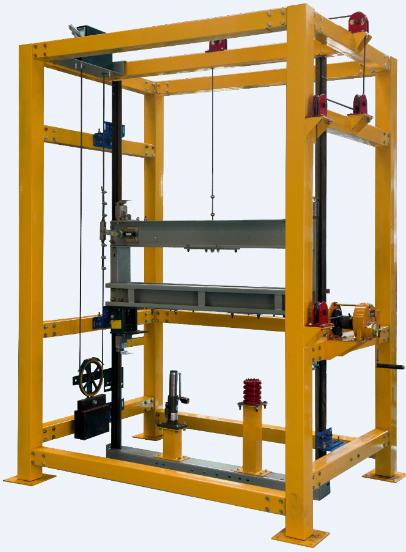 裝置整體框架采用標準方型鋼焊接,各接頭部位全部采用螺栓連接,方便拆裝。用于提升用的手動(dòng)絞盤(pán)裝置采用日本原裝進(jìn)口,通過(guò)觸發(fā)其剎車(chē)裝置可實(shí)現絞轉、空轉功能;手動(dòng)絞盤(pán)通過(guò)鋼絲繩經(jīng)各滑輪組連接底廂底架來(lái)進(jìn)行提升。在轎廂底座下部裝有一個(gè)蓄能型彈簧緩沖器跟一個(gè)耗能型液壓緩沖器;在安全鉗不動(dòng)作或未能在預定距離內停住等意外情況下,避免安全鉗直接撞擊地面,這樣讓受訓學(xué)員了解緩沖器作用、類(lèi)型及工作原理。
