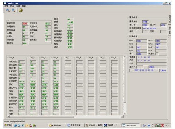 中央空調測試維修控制程序軟件;能夠準確地快速確定故障發(fā)生在哪個(gè)機組,軟件同時(shí)我顯示空調100多個(gè)在線(xiàn)數據和運行狀態(tài),據不同的機型有不同的界面,具體為:1拖16(EVI)、1拖32、數碼模塊化1拖64、變頻模塊化1拖64、熱回收、單機直流變頻、單機交流變頻、智能變頻、單機420、單機900、模塊式風(fēng)冷螺桿等所有中央空調機。