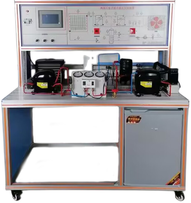 裝置應包含數據采集系統屏、實(shí)訓臺、交流電源控制、低溫保溫箱體,蒸發(fā)器、冷凝器、高級壓縮機、低級壓縮機、冷凝風(fēng)扇、中間冷卻系統等,管路中還設有控制閥等實(shí)訓所必需的部件組成的二級壓壓縮機循環(huán)制冷系統。