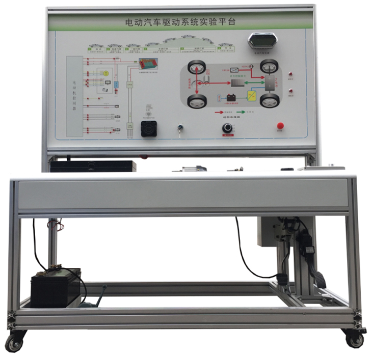 檢測控制面板(裝有各種檢測端子,1448×940mm彩色電路圖和工作原理示意圖)、組合儀表、點(diǎn)火開(kāi)關(guān)、電機控制器、車(chē)載充電器與充電接口、DC-DC轉換器、鋰動(dòng)力電池組、電動(dòng)車(chē)電機(直流無(wú)刷電機)與變速箱、后輪左右液壓制動(dòng)裝置、驅動(dòng)橋傳動(dòng)裝置、剎車(chē)開(kāi)關(guān)、檔位開(kāi)關(guān)、油門(mén)控制裝置、大電流繼電器、電源總開(kāi)關(guān)、急停開(kāi)關(guān)、輔助蓄電池(12V45AH)、一體化全鋁合金型材搭建的移動(dòng)臺架(1500×700×1700mm (帶自鎖腳輪裝置,帶安裝檢測端子的原理面板,面板1448×940mm)、故障考核系統、設備操作說(shuō)明書(shū)。