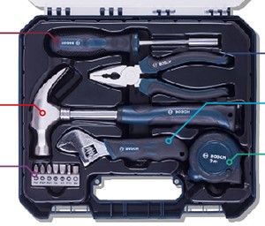 12件套:鋼絲鉗、6*38螺絲批2只、沾塑活扳手、數顯電筆、0.25KG羊角錘、鋼卷尺、美工刀、PVC膠布/6*100螺絲批2只/吹塑盒1只