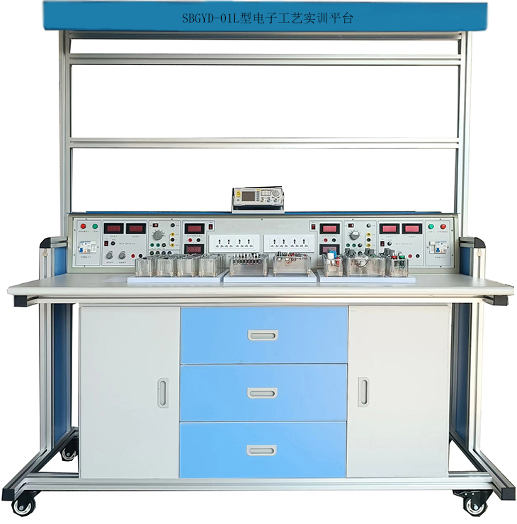 (一)電子工藝實(shí)訓臺:采用工業(yè)鋁合金型材框架,在電源控制屏上方為兩層結構。其中第一層既可放置外配儀器儀表,也可掛放其它通用電工電子實(shí)訓掛箱,擴展完成多門(mén)課程實(shí)訓;第二層可放置PVC夾板,用來(lái)夾放實(shí)訓圖紙。實(shí)訓臺下方還設有四個(gè)帶剎車(chē)的萬(wàn)向輪,便于移動(dòng)和固定。桌面輔有防靜電皮。