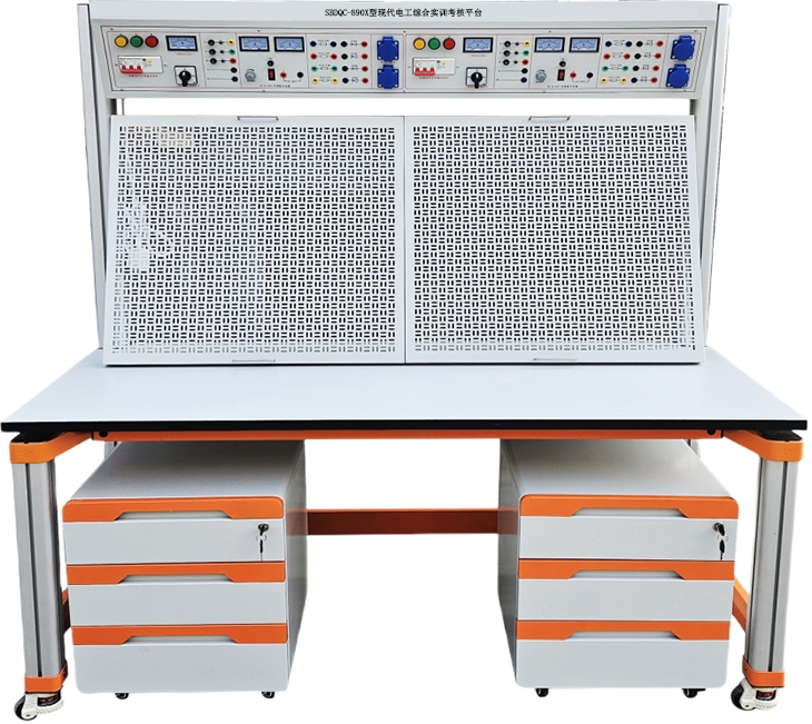 現代電工綜合實(shí)訓考核實(shí)訓臺由實(shí)訓屏(內置電源)、實(shí)訓桌、實(shí)訓儲物柜三大部分組成。