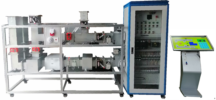 裝置心4040鋁材為主體框架,尺寸:長(cháng)2500MM*寬500MM*高2000MM,框架內包含新風(fēng)井(模擬)、排風(fēng)井(模擬)、新風(fēng)機、回/排風(fēng)機、排煙風(fēng)機、電動(dòng)調節閥、電動(dòng)排煙防火閥、自動(dòng)防煙防火閥、通風(fēng)管路、相關(guān)傳感器以及就地控制柜等。充分地展示了空調通風(fēng)(防排煙)系統結構形式、控制原理。系統主要組成由下面幾個(gè)部分組成