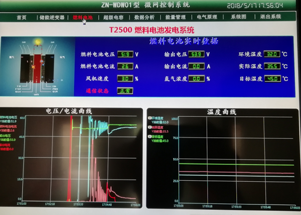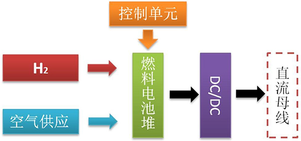 其工作原理是風(fēng)力、光伏發(fā)電系統發(fā)電,并由電池儲能,由儲能逆變系統轉換成交流電后接入電網(wǎng),燃料電池單元所發(fā)的電能經(jīng)DC-DC轉換后送入直流總線(xiàn)作后備儲能;系統可離網(wǎng)運行亦可并網(wǎng)運行,在網(wǎng)端能耗負荷內完成削峰填谷功能。