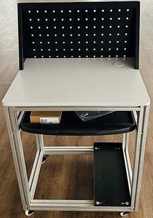 鋼鋁結構,裝有4只萬(wàn)向輪,裝有黑色鋼質(zhì)網(wǎng)孔電腦后靠、鍵盤(pán)托、主機支架。