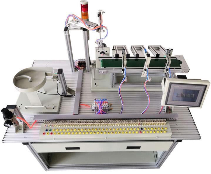 機電一體化實(shí)訓裝置臺架為鋁合金導軌式,實(shí)訓考核裝置PLC模塊的I/O 端子、變頻器的接線(xiàn)端子、各常用模塊與PLC的連接端子,均與安全插座連接,使用帶安全插頭的導線(xiàn)進(jìn)行電路連接;各指令開(kāi)關(guān)、光電開(kāi)關(guān)、傳感器和指示元件的電路,則通過(guò)端子排進(jìn)行連接。插拔線(xiàn)連接電路與端子牌連接電路相結合,既保證學(xué)生基本技能的訓練、形成和鞏固,又保證電路連接的快速、安全和可靠。