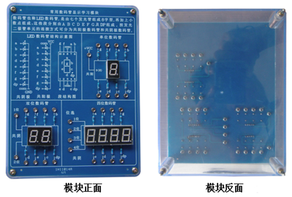 展示共陰及共陽(yáng)數碼管的結構示意圖及常用數字的數碼顯示方法,展示了單位數碼管、雙位數碼管、四位數碼管的實(shí)物并提供了可供檢測的臺階插座(內孔2MM)。