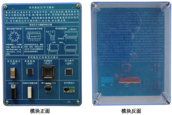 底盒使用190mm×145mm的開(kāi)模有機透明塑料底盒,模塊面板采用印制電路板PCB工藝,可以直觀(guān)看到器件的實(shí)物及相關(guān)的原理介紹。對于典型應用及易損器件安裝在面板背面,透過(guò)透明底盒能夠看到器件實(shí)物,方便感性認識、檢測測試,同時(shí)也能防止器件的損傷。